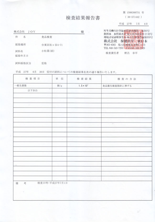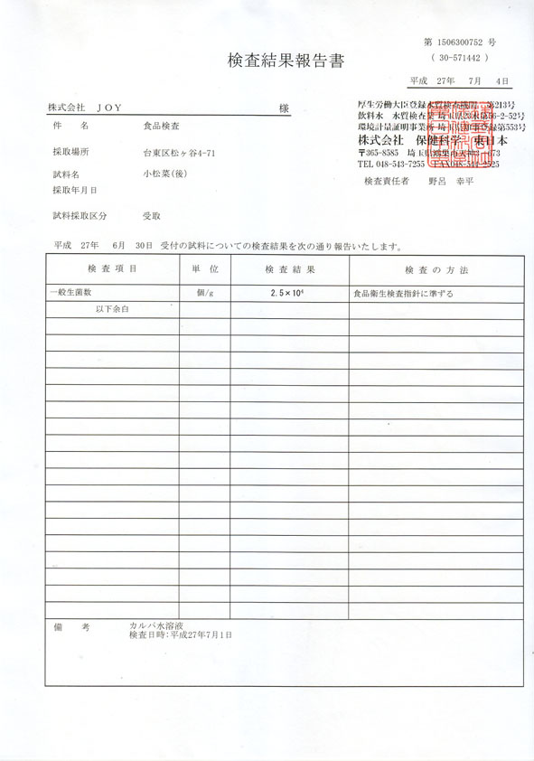 ![]() ●小松菜 試験検査報告書 一般生細菌 99.8%の除去 |