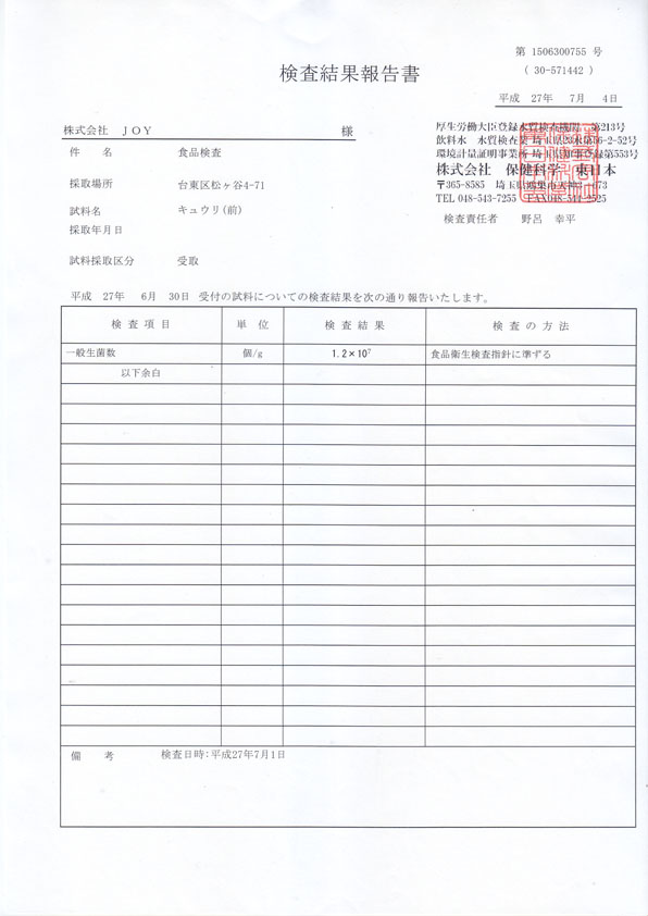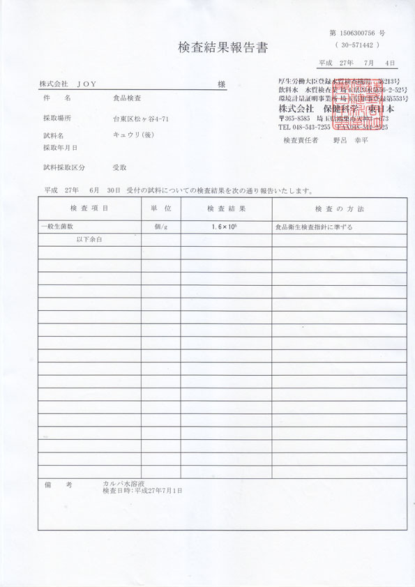 ![]() ●キュウリ 試験検査報告書 一般生細菌 98.6%の除去 |
