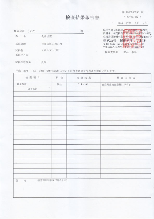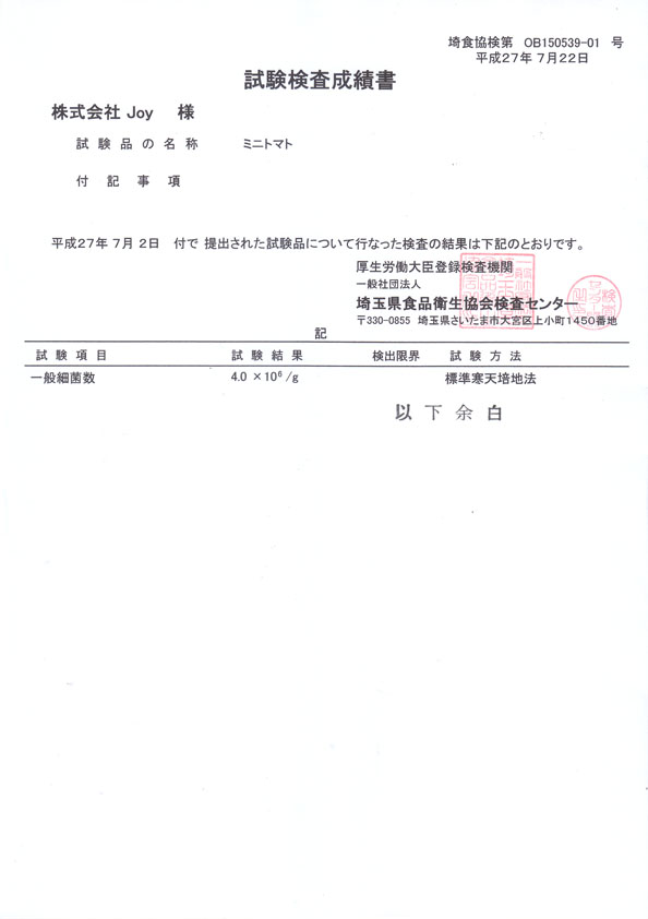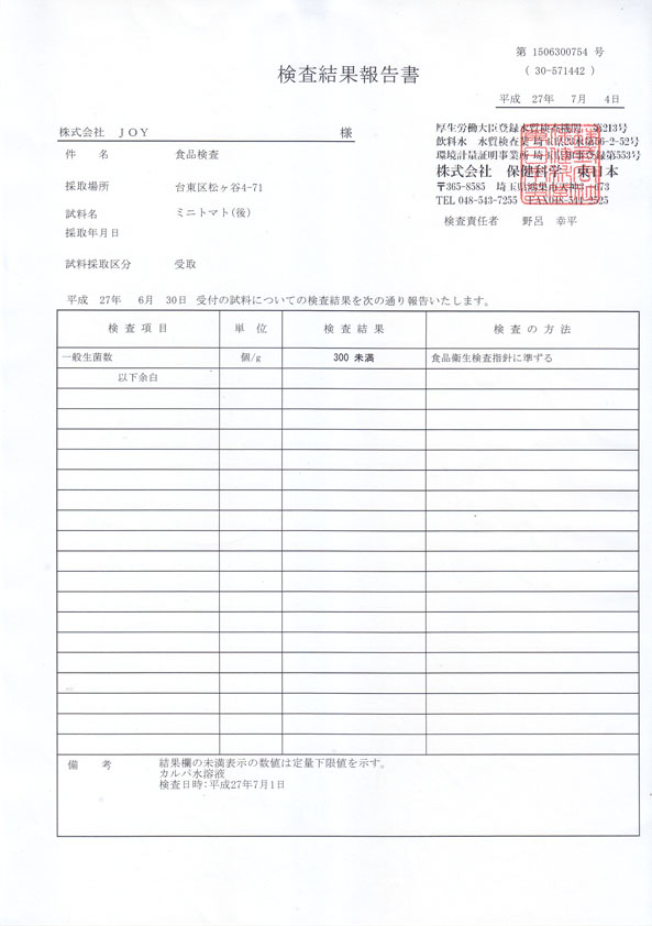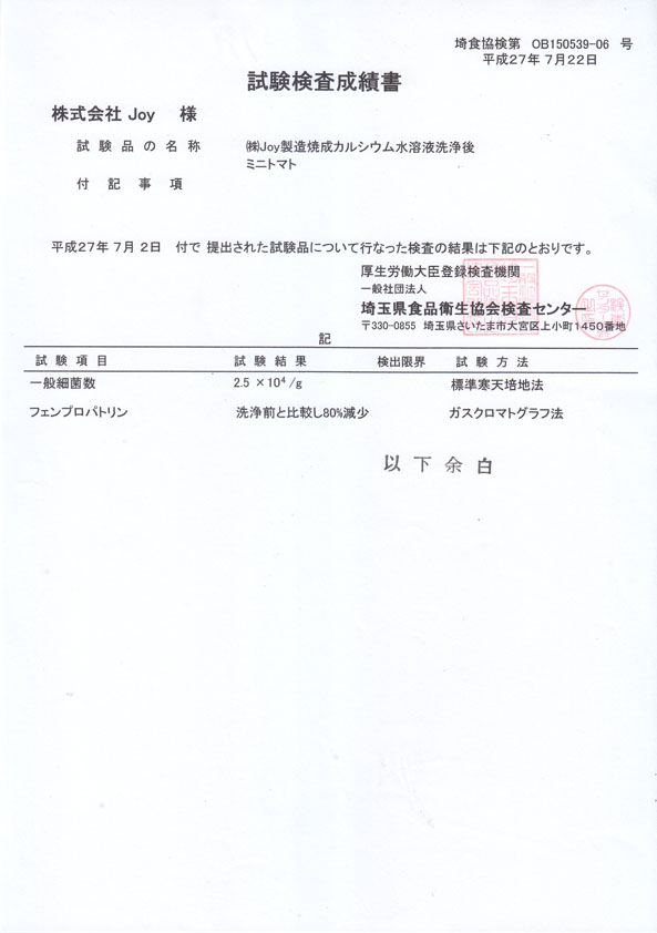 ![]() ●ミニトマト 試験検査報告書 一般生細菌 99.6%の除去 農 薬 80%の除去 |