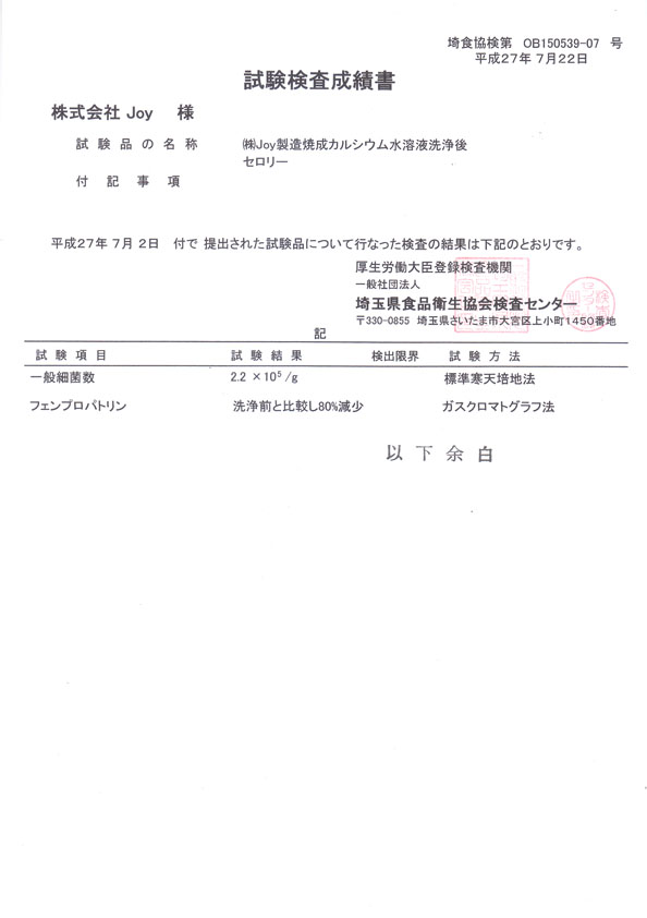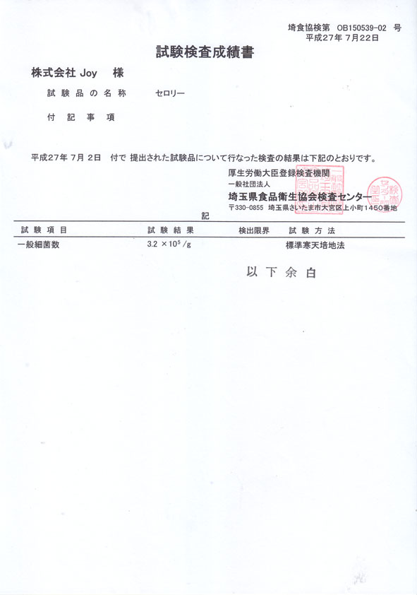 ![]() ●セロリ 試験検査報告書 一般生細菌 68%の除去 農 薬 80%の除去 |