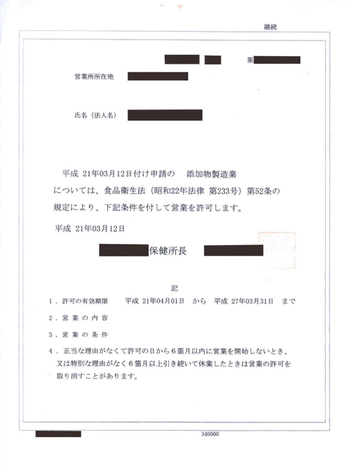 ![]() 食品添加物製造許可証 |