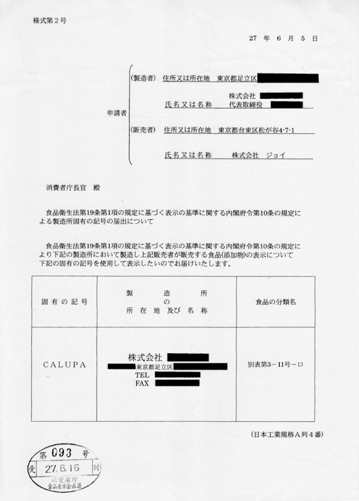 ![]() ![]() 消費者庁製造固有記号の届出書 |